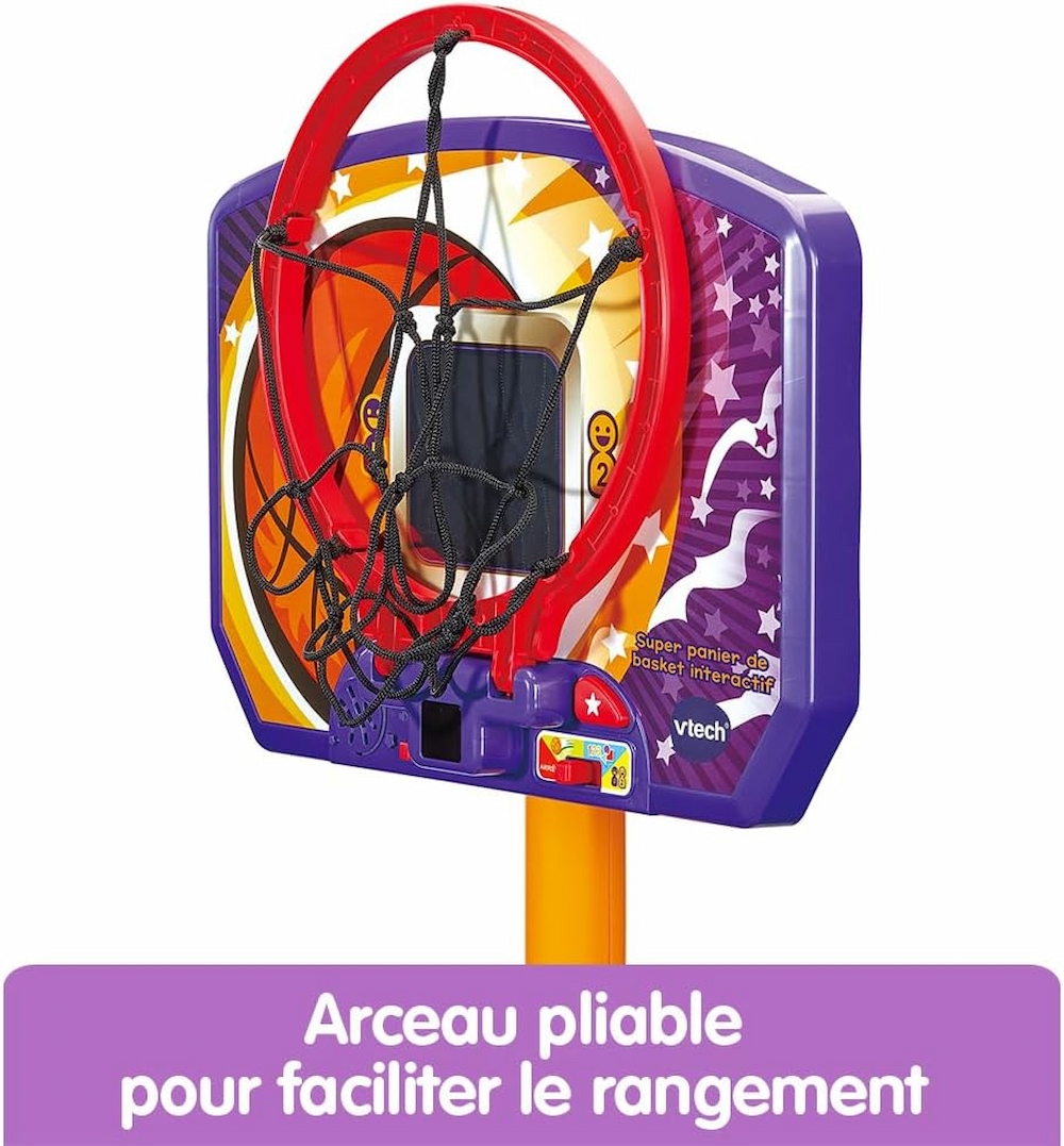 Canasta de baloncesto Vtech interactiva de con pantalla electrónica, diseñada para que los niños combinen deporte y aprendizaje de forma divertida.